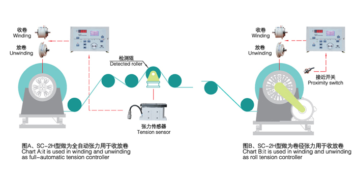 SC-2H型自動(dòng)張力控制儀采用液晶顯示器,可選擇中、英文顯示,界面友好易用,可輸出0-24V/4A直接驅(qū)動(dòng)磁粉離合器、磁粉制動(dòng)器;也可輸出0-5V,0-10V信號(hào),控制變頻器、伺服電機(jī)或其它執(zhí)行機(jī)構(gòu),對(duì)卷繞系統(tǒng)進(jìn)行高精度的張力控制。可廣泛應(yīng)用于造紙、印刷、包裝、紡織、印染等行業(yè)。